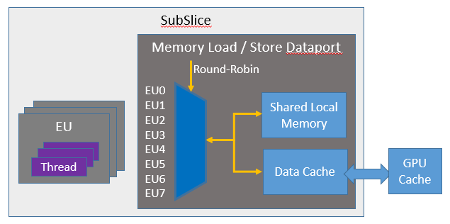 VE threads make memory accesses by sending messages to a data-port, the load instruction sends address and receives data, The store instructions send address and data. All VE in Xe-core share one Memory Load/Store data-port as shown in the figure below.