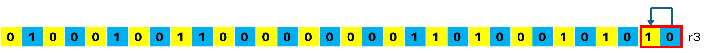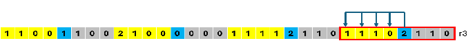 Compiler will produce one SIMD 16 instruction to add the bit value from the even position elements (highlighted in blue) to odd position elements (highlighted in yellow). The register region syntax r3.1<2;1,0>:uw means the element data type is an unsigned word, the stride is 2, and the starting offset is r3.1: