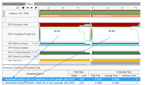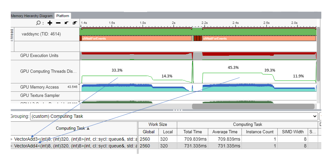 The chart from VTune below shows that the measured GPU occupancy for VectorAdd3 and VectorAdd4 kernels.