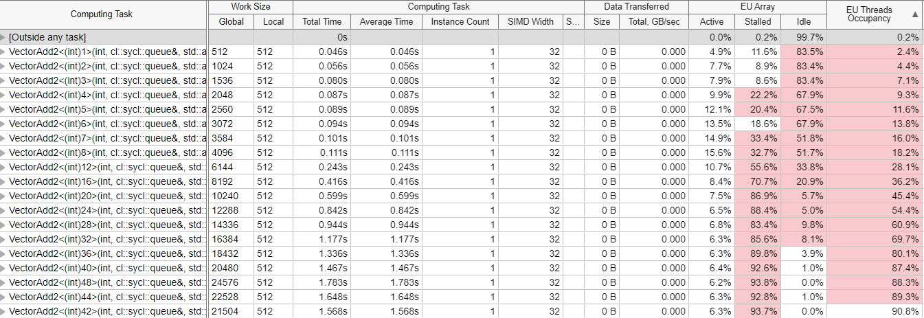 The same kernels as above when run with a work-group size that is a multiple of the number of threads in a Xe-core and lot more work-groups gets good utilization of the hardware achieving close to 100% occupancy, as shown below.