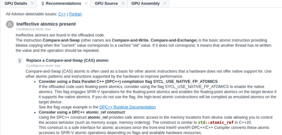 One of the recommendations that Intel® Advisor provides is “Inefficient atomics present”. When atomics are not natively supported in hardware, they are emulated. This can be detected and Intel® Advisor gives advice on possible solutions.