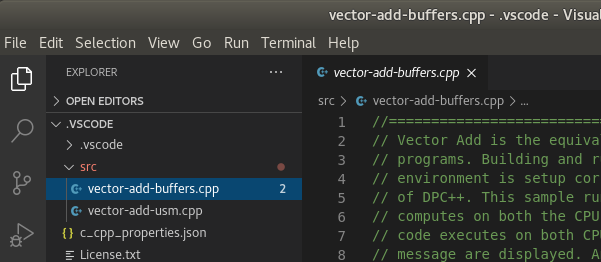 { "configurations": [ { "name": "Linux", "includePath": [ "${workspaceFolder}/**", "/opt/intel/oneapi/**" ], "defines": [], "compilerPath": /opt/intel/oneapi/compiler/latest/linux/bin/dpcpp", "cStandard": "c17", "cppStandard": "c++17", "intelliSenseMode": "linux-clang-x64" } ], "version": 4 }NOTE:If necessary, replace the path to the oneAPI components with the one that is relevant for your installation folder.