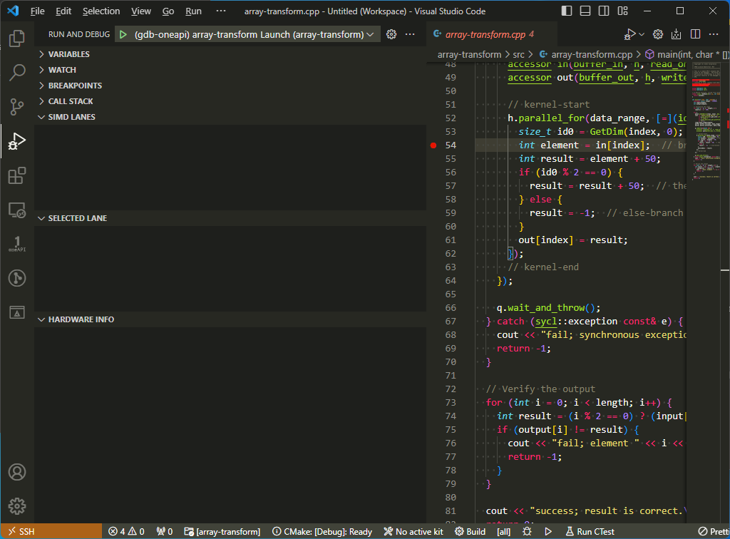Using the VS Code Explorer, open the source code file or files that contain the section of code you plan to debug. In the example below, the array-transform.cpp file has been opened and a breakpoint has been set at line #54.