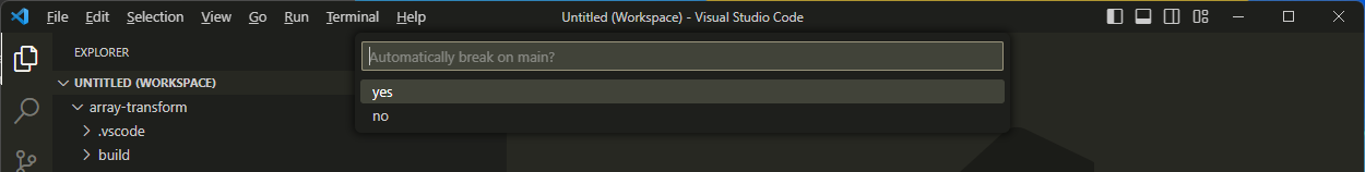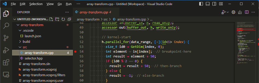 Using the VS Code Explorer, open the source code file or files that contain the section of code you plan to debug. In the example below, the array-transform.cpp file has been opened and a breakpoint has been set at line #54.