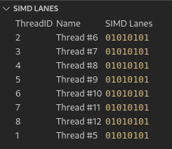 This extension provides a view in the debug view that displays the SIMD lane state of a Intel GPU thread. The view will automatically populate when hitting a GPU thread breakpoint.