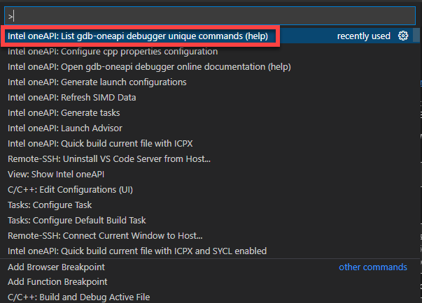 Select Intel oneAPI: List gdb-oneapi debugger unique commands (help).