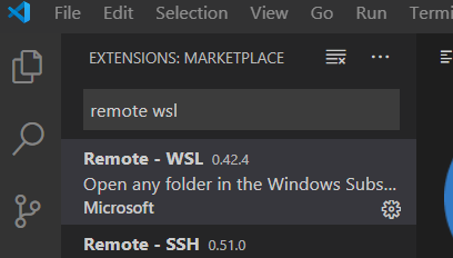 Install the Remote - WSL extension by Microsoft. Click the Extensions icon and search for “remote wsl” in the search bar.