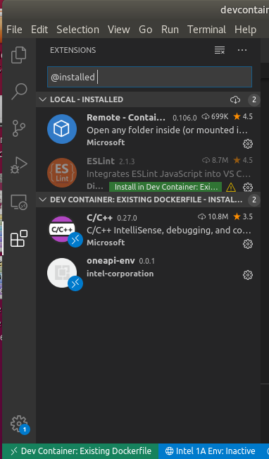 // Add the IDs of extensions you want installed when the container is created. "extensions": ["ms-VS Code.cpptools"],NOTE:The Intel extension is not POR and it is not available in the Marketplace.If you will be using a ptrace-based debugger for programming languages such as C++, Go, and Rust, you will need to enable debugging within the container. Uncomment the “runArgs” line in .devcontainer/devcontainer.json: