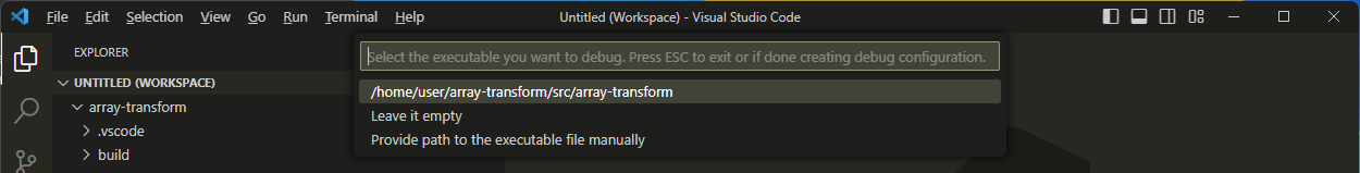 Follow the prompts to add launch configurations. First, select the executable: