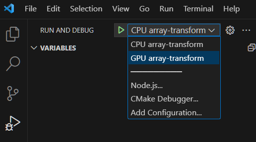 This launch.json file is configured to work with the “array-transform” example application. It provides two configurations named “CPU array-transform” and “GPU array-transform”.