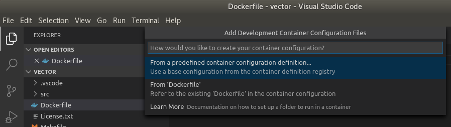VS Code will automatically use the Dockerfile you just created to download the image, create the container, and open the project inside of the container.