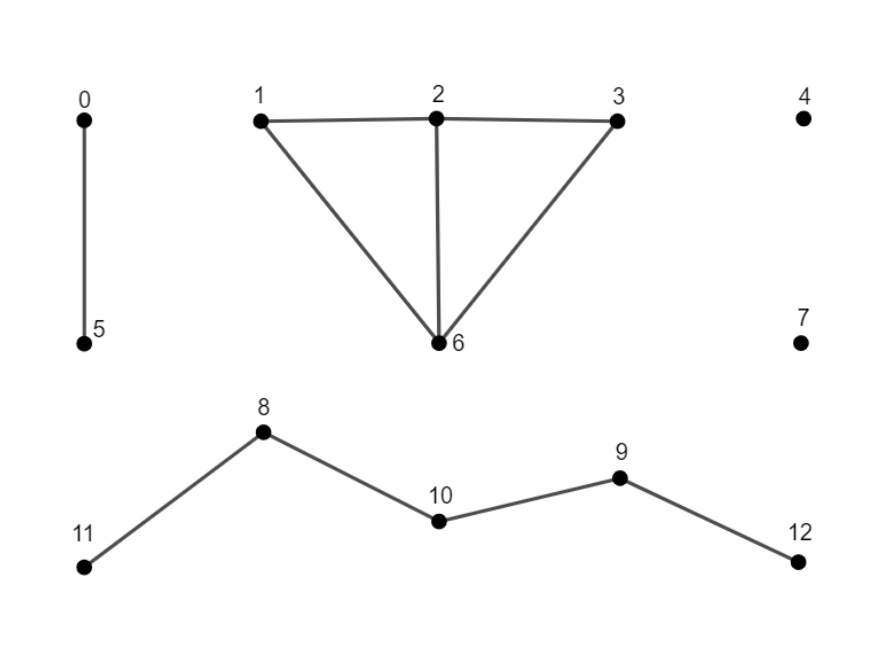 Сomponents are labeled from 0 to k-1, where k is the number of components. For the example above, the labels for vertices are [0, 1, 1, 1, 2, 0, 1, 3, 4, 4, 4, 4, 4].
