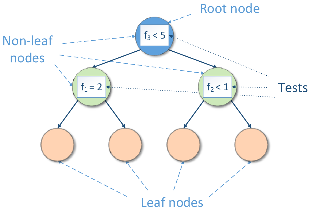 , where f is a feature and c is a constant fitted during decision tree induction), the inducted decision tree is a binary tree, so its each non-leaf node has exactly two branches (‘true’ and ‘false’) according to the result of the Boolean expression.