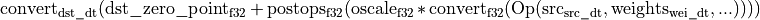During a primitive computation, oneDNN can use different datatypes than those of the inputs/outputs. In particular, oneDNN uses wider accumulator datatypes (s32 for integral computations, and f32/f64 for floating-point computations), and converts intermediate results to f32 before applying post-ops (f64 configuration does not support post-ops). The following formula governs the datatypes dynamic during a primitive computation: