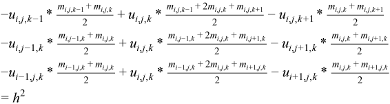 To obtain a numerical solution, an equidistant grid with grid step h in the domain D is chosen, and the partial differential equation is approximated using finite differences. This procedure [Smith86] yields a system of nonlinear algebraic equations: