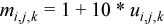 Each equation ties together the value of the unknown grid function u and the value of the respective right hand side at seven grid points. The left hand sides of the equations can be represented as linear combinations of the grid function values with coefficients which depend on the solution itself. Introducing a matrix composed of these coefficients, the equations can be rewritten in vector-matrix form: