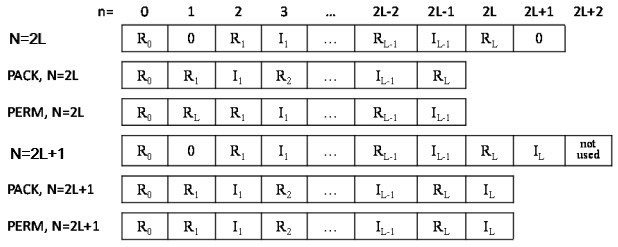 The following figure illustrates the storage of a one-dimensional (1D) size-N conjugate-even sequence in a real array for the CCS, PACK, and PERM packed formats. The CCS format requires an array of size N+2, while the other formats require an array of size N. Zero-based indexing is used.