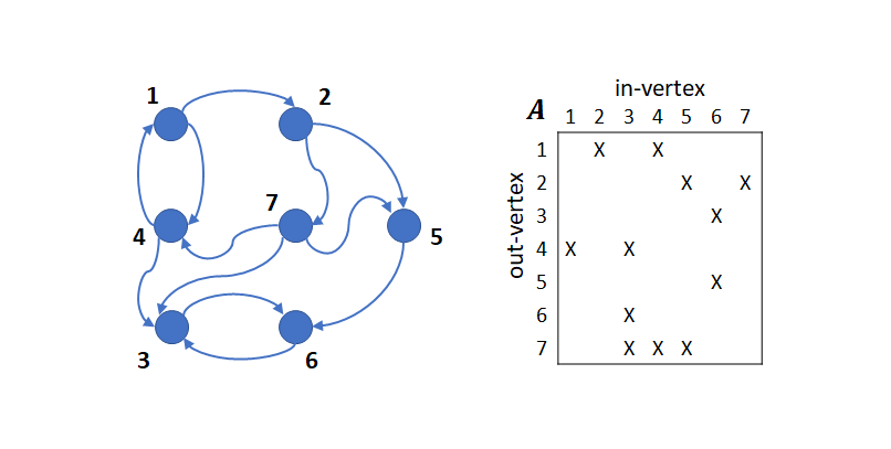 In the figure above, an example directed graph with seven vertices and 12 edges is presented with its adjacency matrix A. For simplicity, only the structure of the matrix is used and for this, denote non-zero entries by X. Row and column indices correspond to the tails and heads of the edges, respectively.