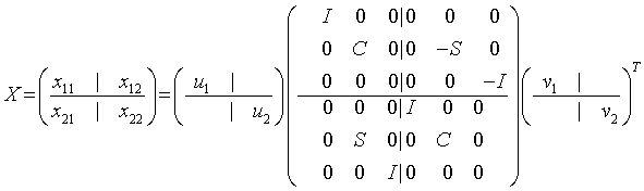 x11 is p-by-q. The orthogonal/unitary matrices u1, u2, v1, and v2 are p-by-p, (m-p)-by-(m-p), q-by-q, (m-q)-by-(m-q), respectively. C and S are r-by-r nonnegative diagonal matrices satisfying C2 + S2 = I, in which r = min(p,m-p,q,m-q).