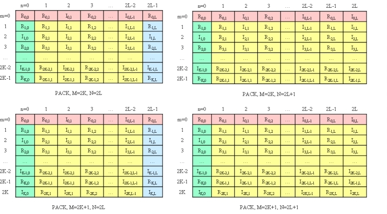The following figure illustrates the storage of a 2D M-by-N conjugate-even sequence in a real array for the PACK packed format. This format requires an array of size M-by-N. Row-major layout and zero-based indexing are used. Different colors mark logically separate parts of the result.