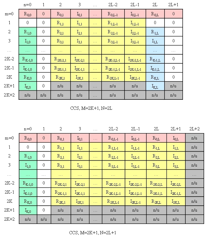 The following figure illustrates the storage of a two-dimensional (2D) M-by-N conjugate-even sequence in a real array for the CCS packed format. This format requires an array of size (M+2)-by-(N+2). Row-major layout and zero-based indexing are used. Different colors mark logically separate parts of the result. "n/u" means "not used".