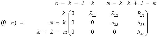 On exit, the location of nonzero element ri j (1 ≤i≤j≤k + l) of R depends on the value of i. For i≤m this element is stored in a[(i - 1) + (n - k - l + j - 1)*lda] for column major layout and in a[(i - 1)*lda + (n - k - l + j - 1)] for row major layout. For m < i≤k + l it is stored in b[(i - k - 1) + (n - k - l + j - 1)*ldb] for column major layout and in b[(i - k - 1)*ldb + (n - k - l + j - 1)] for row major layout.