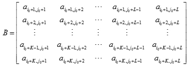 B is formed from rows with indices i0 + 1 to i0 + K and columns j0 + 1 to j0 + L of matrix A. To specify matrix B, LAPACK routines require four parameters: