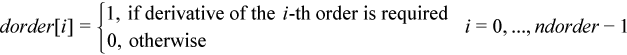 Array of size ndorder that defines the order of the derivatives to be computed at the interpolation sites. If all the elements in dorder are zero, the library computes the spline values only. If you do not need interpolation computations, set ndorder to zero and pass a NULL pointer to dorder.