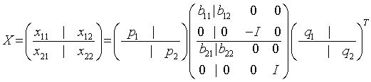 The orthogonal/unitary matrices p1, p2, q1, and q2 are p-by-p, (m-p)-by-(m-p), q-by-q, (m-q)-by-(m-q), respectively. They are represented implicitly by Housholder vectors.