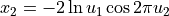 Generates normally distributed random numbers x1 and x2 thru the pair of uniformly distributed numbers u1 and u2 according to the formulas: |