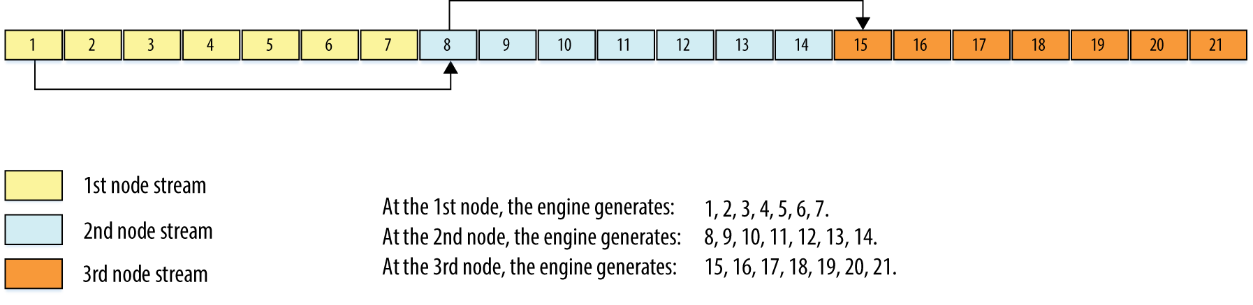 The oneapi::mkl::rng::skip_ahead function skips a given number of elements in a random sequence provided by engine. This feature is particularly useful in distributing random numbers from original engine across different computational nodes. If the largest number of random numbers used by a computational node is num_to_skip, then the original random sequence may be split by oneapi::mkl::rng::skip_ahead into non-overlapping blocks of num_to_skip size so that each block corresponds to the respective computational node. The number of computational nodes is unlimited. This method is known as the block-splitting method or as the skip-ahead method (see the following figure).