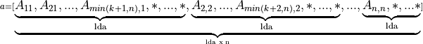 A triangular band matrix A of n rows and n columns with k sub/super-diagonals and leading dimension lda is represented as a one dimensional array a of size at least lda * n.