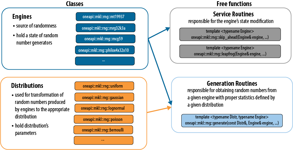 This section represents manual offload RNG routines, including engines and distributions classes templates, generate function, and service routines.