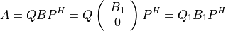 where B1 is an n-by-n upper diagonal matrix, Q and P are orthogonal or, for a complex A, unitary matrices; Q1 consists of the first n columns of Q.