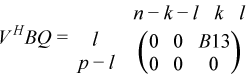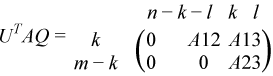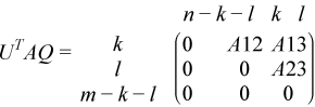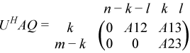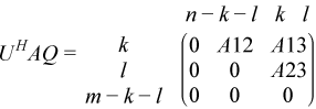 where the k-by-k matrix A12 and l-by-l matrix B13 are nonsingular upper triangular; A23 is l-by-l upper triangular if m-k-l≥ 0, otherwise A23 is (m-k-by-l upper trapezoidal. k + l = the effective numerical rank of the (m + p)-by-n matrix (AT,BT)T for real flavors or (AH,BH)H for complex flavors.