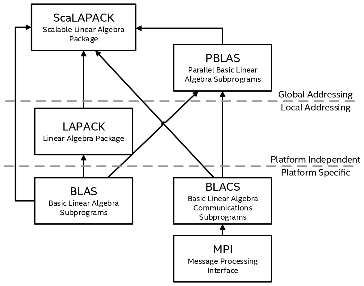 ScaLAPACK is closely tied to other components, including BLAS, BLACS, LAPACK, and PBLAS.