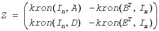 Here Ik is the identity matrix of size k and XT is the transpose/conjugate-transpose of X. kron(X, Y) is the Kronecker product between the matrices X and Y.