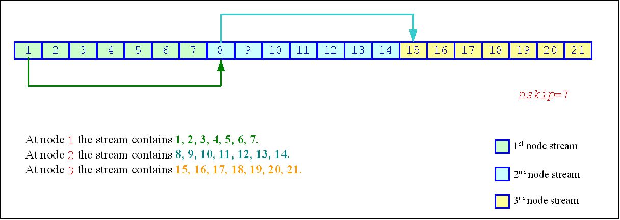 The vslSkipAheadStream function skips a given number of elements in a random stream. This feature is particularly useful in distributing random numbers from original random stream across different computational nodes. If the largest number of random numbers used by a computational node is nskip, then the original random sequence may be split by vslSkipAheadStream into non-overlapping blocks of nskip size so that each block corresponds to the respective computational node. The number of computational nodes is unlimited. This method is known as the block-splitting method or as the skip-ahead method. (see Figure "Block-Splitting Method").