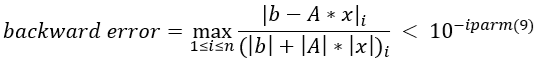 | iparm(9) input | Tolerance level for the backward error in the iterative refinement process. If set to a non-zero value, the following criterion is used for stopping the iterative refinement: