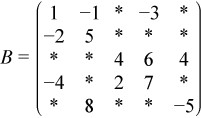 Additionally, you can define submatrices with different pointerB and pointerE arrays that share the same values and columns arrays of a CSR matrix. For example, you can represent the lower right 3x3 submatrix of B as: