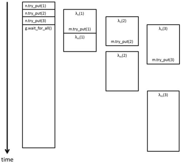 As each task from n finishes, it puts its output to m, since m is a successor of n. Unlike node n, m has been constructed with a concurrency limit of 1 and therefore does not spawn all tasks immediately. Instead, it sequentially spawns tasks to execute its body, λm, on the messages in the order that they arrive. When all tasks are complete, the call to wait_for_all returns.