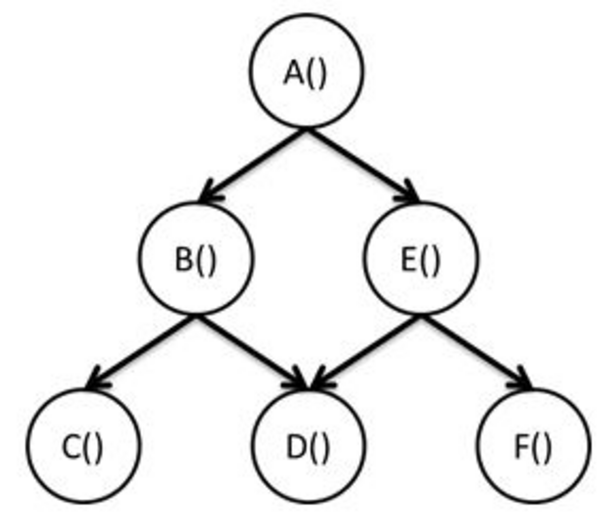 The following figure shows another example of a dependence graph. It has the same topology as the figure above, but with simple functions replacing the sandwich making steps. In this partial ordering, function A must complete executing before any other computation starts executing. Function B must complete before C and D start executing; and E must complete before D and F start executing. This is a partial ordering because, for example, there is no explicit ordering requirement between B and E or C and F.