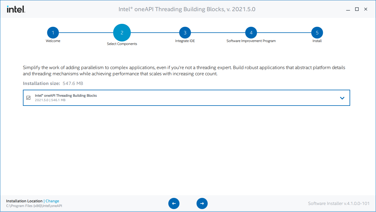 At the Integrate IDE step, the program checks if it is possible to deploy oneTBB using Microsoft* Visual Studio* IDE. If IDE is not installed, you can exit the setup and restart it after installing the IDE or proceed without integration.