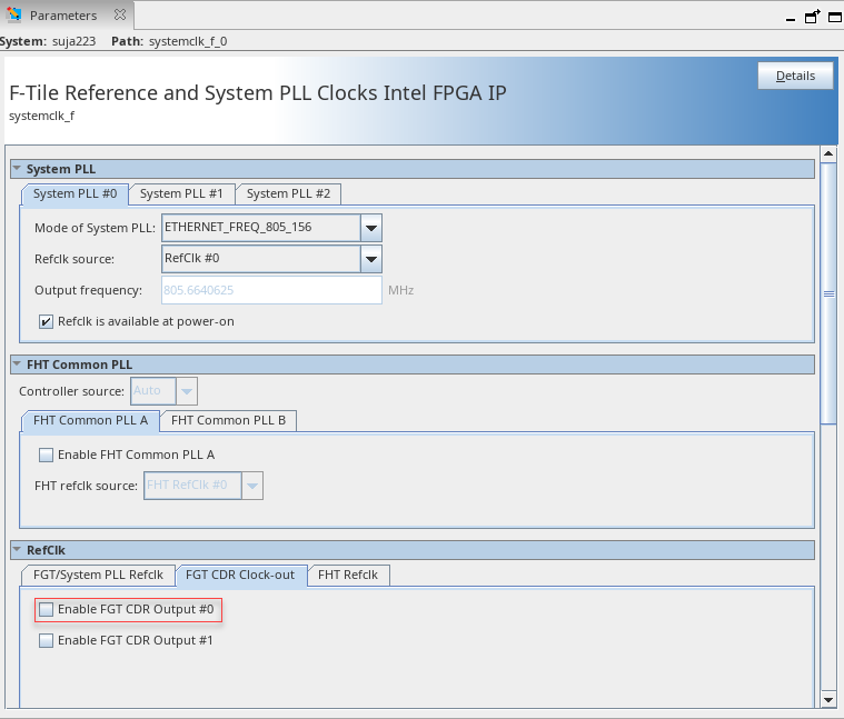 Note: In the IP Parameter Editor, you can Enable the dedicated CDR clock output for multiple IPs. However, if you want to enable two dedicated CDR clock outputs from different IPs, Enable FGT CDR Output #0 and Enable FGT CDR Output #1 must be enabled in the system PLL.