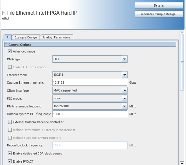 To enable the recovered clock output from F-tile, select the Enable dedicated CDR Clock Output in the IP parameter editor as shown below.