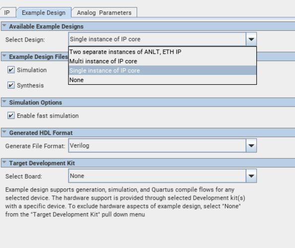 2. In the Select Design parameter under Available example Designs, you can select the following options: