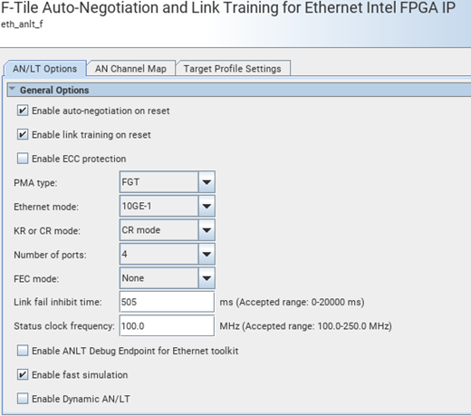 The F-Tile Auto-Negotiation and Link Training for Ethernet Intel® FPGA IP parameter editor provides the parameters you can set to configure your IP variation.