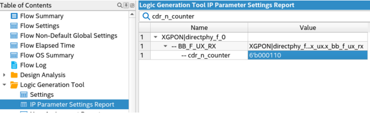 2. Open Compilation Report, then go to Logic Generation Tool > IP Parameter Settings Report.