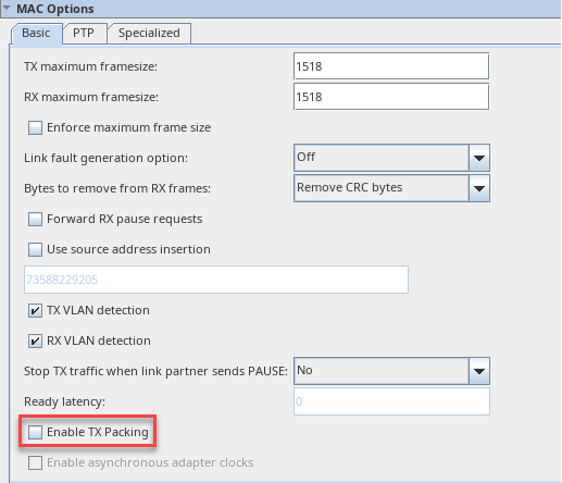 • The TX Packing feature is disabled by default to ensure backward compatibility with the previous IP version. If you do not want to run the IP at full traffic throughput, use the disable option for lower IP utilization and latency. The maximum TX MAC throughput is reduced when sending unpacked data with idle segments in between packets while TX packing is disabled.