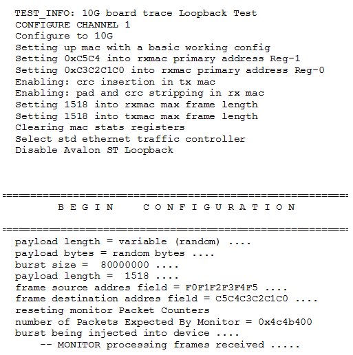 Table 17. Command Parameters Parameter Valid Values Description channel 0, 1 The channel number to test. speed 10M, 100M, 1G, 2P5G, 5G, 10G The PHY speed. burst_size An integer value The number of packets to generate for the test. - When the test is completed, observe the output displayed. The following diagrams show excerpts of the output, which shows that the Ethernet packet monitor block receives the same number of packets generated without error, and the TX and RX statistics counters.